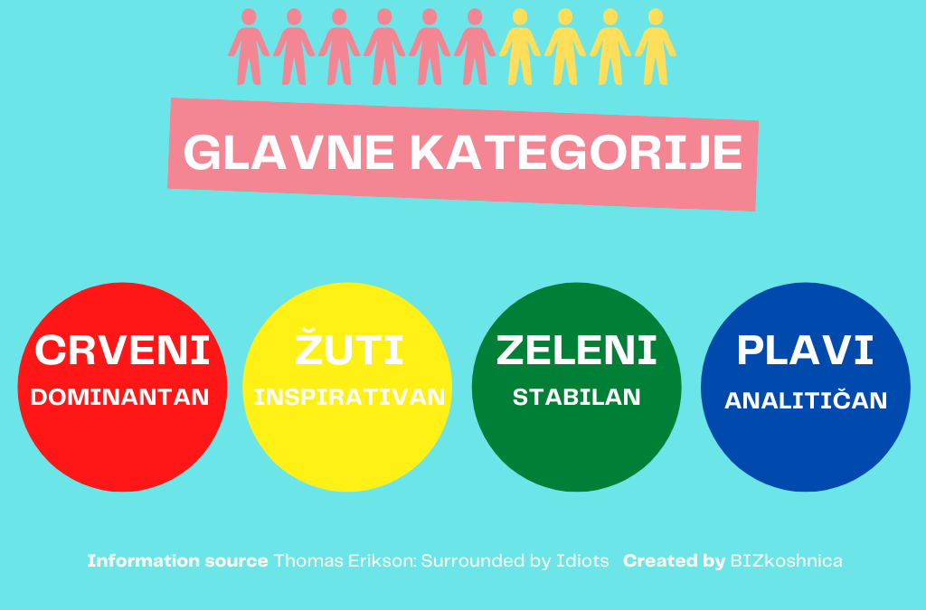 Thomas Erikson, autor svjetskog bestselera Okruženi idiotima, u svojoj knjizi opisuje različite tipove ličnosti. Dijeli ih na Crvene, Žute, Zelene i Plave. Na zanimljiv i duhovit način autor prikazuje karakteristike i primjere situacija u kojima pojedina boja (tip) reagira. Autor napominje da je najčešći ishod da osoba sadrži dvije boje, stoga ćemo teško kategorizirati osobu u jednu boju, ali svakako neke sličnosti možemo pronaći.